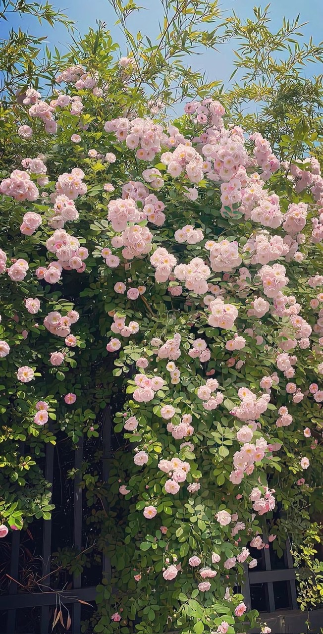 Giữa ánh nắng trong vắt đầu hè, giàn hoa hồng leo bung nở như một bức tranh sống động của thiên nhiên. Những cánh hồng phớt dịu dàng, chen chúc nhau trên nền lá xanh mướt, khiến người ta như lạc vào một khu vườn cổ tích.