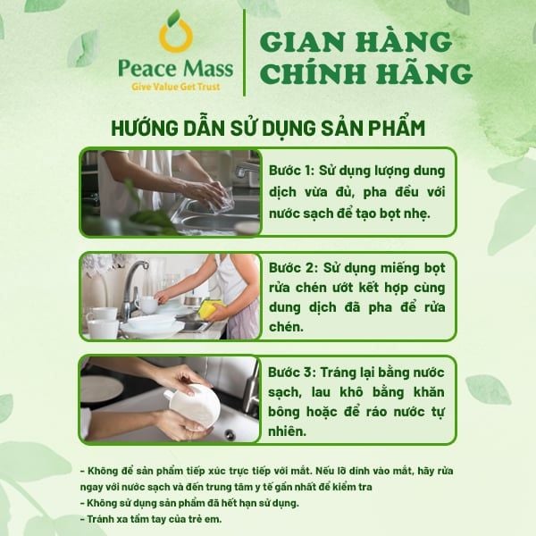 Hướng dẫn sử dụng: Lấy một lượng nước rửa chén vừa đủ cho vào miếng rửa chén đã được thấm ướt, bóp nhẹ để tạo bọt rồi rửa chén, rửa sạch lại bằng nước.